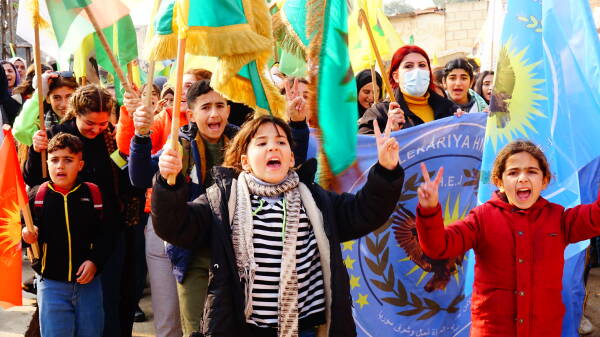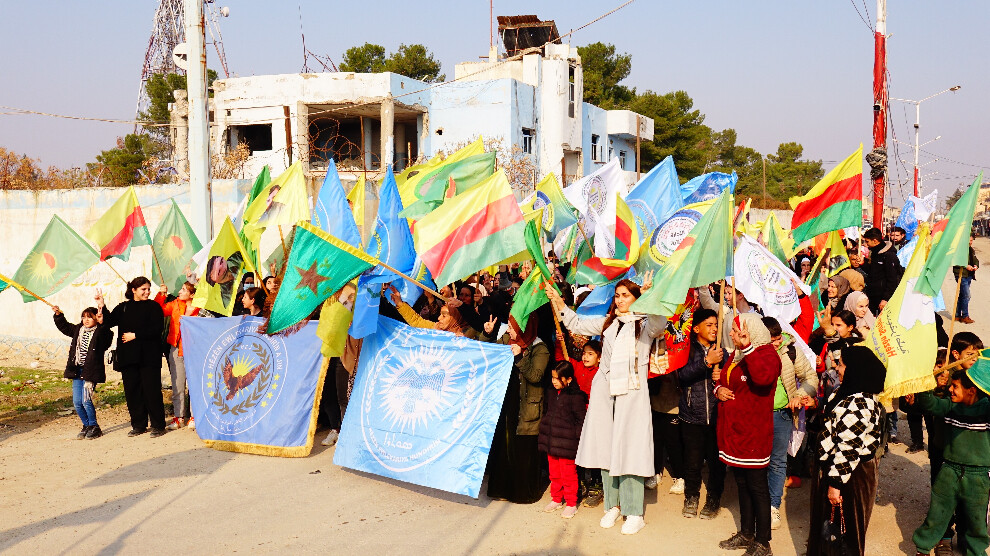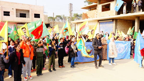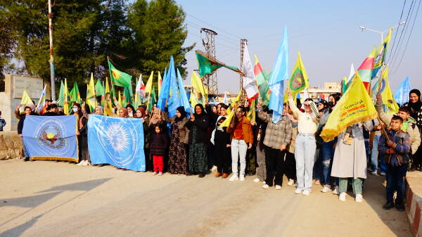 Meşa ku ji ber ofîsa Partiya Yekîtiya Demokratîk (PYD) destpê kir bi dehan jin û mêr û xwendekarên dibistanan tevî mamosteyên wan beşdar bûn. Di meşê de diruşmeyên piştgiriyê û hevgirtinê hatin berz kirin.