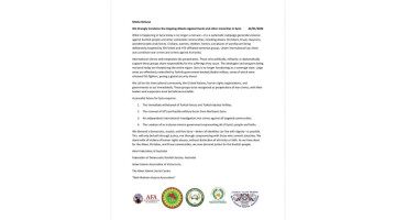Saziyên Elewiyan ên li Awistralyayê di daxuyaniya xwe ya hevpar de destnîşan kirgn ku tiştê îro li Sûriyeyê diqewime êdî nikare wekî şerekî navxweyî were binavkirin û wek kampanyayek tundiyê ya sîstematîk û qirkirinê ye ku li dijî gelê Kurd û civakên din