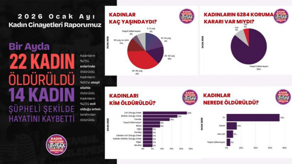 بەپێی ڕاپۆرتی پلاتفۆرمی تاوانەکانی سەر ژنان ڕادەگرین "KCDP" دا هاتووە لە شارەکانی باکووری کوردستان و تورکیا لە مانگی کانوونی دووەم-دا ٢٢ ژن کوژراون و ١٤ ژنیش بە شێوەیەکی گوماناوی گیانیان لەدەستداوە.