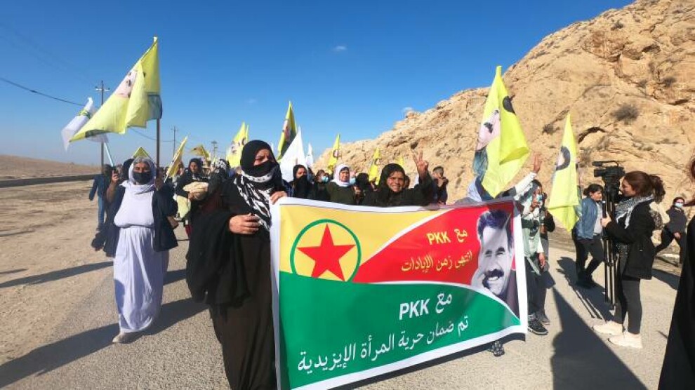 بە پێشەنگایەتیی تەڤگەری ئازادی ژنانی ئێزدی، ژنانی ئێزدی و عەرەب لە شەنگال بۆ شەرمەزارکردنی پیلانگێڕیی نێودەوڵەتی و گۆشەگیریی تووندی سەر ڕێبەری گەلی کورد عەبدوڵا ئۆجالان ڕێپێوانیان کرد.