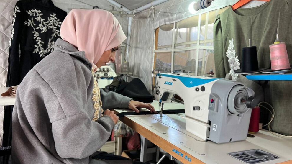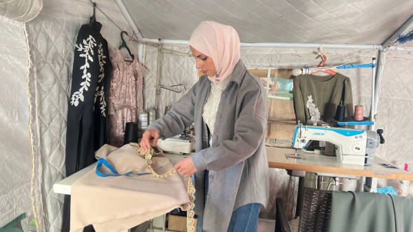 Gazze’nin El-Zuhur Kampı’nda yaşayan Israa Abu Al-Qumsan, çadırında kurduğu dikiş makinesiyle yeniden üretime dönerek, “Sadece hayatta kalmak için çalışmıyorum, koşullar ne olursa olsun yeniden başlayabileceğimi kanıtlamak istiyorum” diyor.