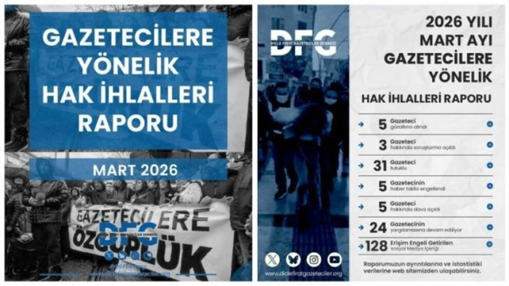 Dicle Fırat Gazeteciler Derneği raporuna göre Mart ayında gazetecilere yönelik gözaltı, tutuklama ve dijital sansür uygulamaları arttı; tutuklu gazeteci sayısı 31’e yükseldi, basın özgürlüğü sistematik şekilde kısıtlandı.