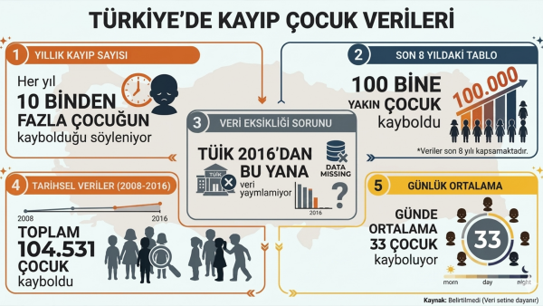 Türkiye’de kayıp çocuklar meselesi de gündemdeki yerini koruyor. Türkiye’de her yıl 10 binden fazla, son 8 yılda ise 100 bine yakın çocuğun kaybolduğu iddia ediliyor. Devlet yetkilileri bu iddiaları yalanlarken bir yandan da ellerinde resmi bir istatistik olmadığını belirtiyor. TÜİK’in kayıp çocuklarla ilgili 2016’dan bu yana veri yayımlamaması, sorunu görünmez kılıyor. Oysa 2008–2016 yılları arasında 104 bin 531 çocuk kayboldu; bu, günde ortalama 33 çocuğun kaybolduğu anlamına geliyor. Açık verilerde 2015–2023 döneminde her yıl binlerce çocuğun “kayıp (bulunan)” olarak kaydedildiği görülüyor.