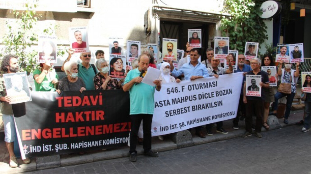 İstanbul - İnsan Hakları Derneği (İHD) İstanbul Şubesi Hapishane Komisyonu, hasta tutukluların durumuna dikkat çektikleri “F Oturumu” eyleminin 546’ıncısını gerçekleştirdi. Dernek binası önünde yapılan bu haftaki eylemde Kayseri Bünyan Kadın Kapalı Cezaevi'nde tutuklu bulunan ağır hasta tutsak Dicle Bozan’ın sağlık durumuna dikkat çekildi.