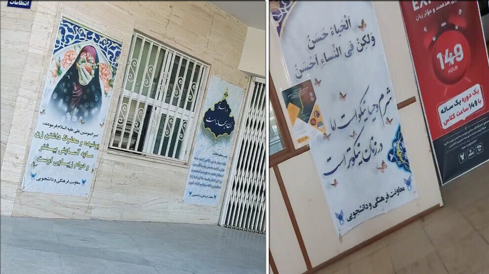 Urmiye – İran ve Doğu Kurdistan’da özellikle “Jin, Jiyan, Azadî” ayaklanmasının ardından, kadın öğrenciler üzerindeki baskılar belirgin şekilde artış gösterdi. Üniversitelerde girişlerde denetimlerin sıkılaştırılması, güvenlik kameralarının yaygınlaştırılması ve öğrencilere yönelik baskıcı önlemler hayata geçirildi. Ancak asıl dikkat çeken unsur, kadınları hedef alan pankartların sayısındaki önemli artış oldu. Üniversitelerin eğitim binalarının tüm katlarında, kıyafet yönetmeliği ve ‘iffetli, makbul kadın’ tanımını örtülü kadın olarak dayatan bu pankartlar, halka açık şekilde sergileniyor.