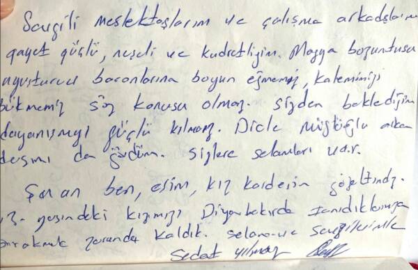 “Sevgili meslektaşlarım ve çalışma arkadaşlarım. Gayet güçlü neşeli ve kudretliyim. Mafya bozuntusu, uyuşturucu baronlarına boyun eğmemiz, kalemimizi bükmemiz söz konusu olamaz. Sizden beklediğim dayanışmayı güçlü kılmanız. Dicle Müftüoğlu arkadaşımı da gördüm, sizlere selamları var. Ben, eşim, kız kardeşim gözaltındayız. 13 yaşındaki kızımızı Diyarbakır’da tanıdıklarımıza bırakmak zorunda kaldık. Selam ve sevgilerimle.”