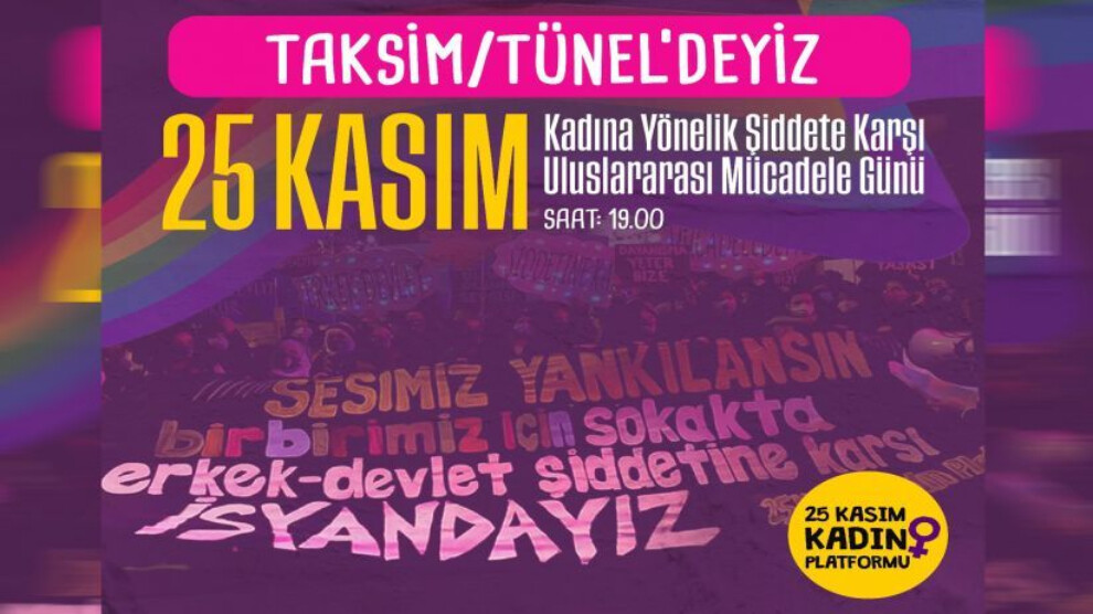 Haber Merkezi- 25 Kasım Kadın Platformu, 25 Kasım Kadına Yönelik Şiddete Karşı Uluslararası Mücadele Günü'nde bir kez daha Taksim Tünel'de buluşacaklarını duyurdu.