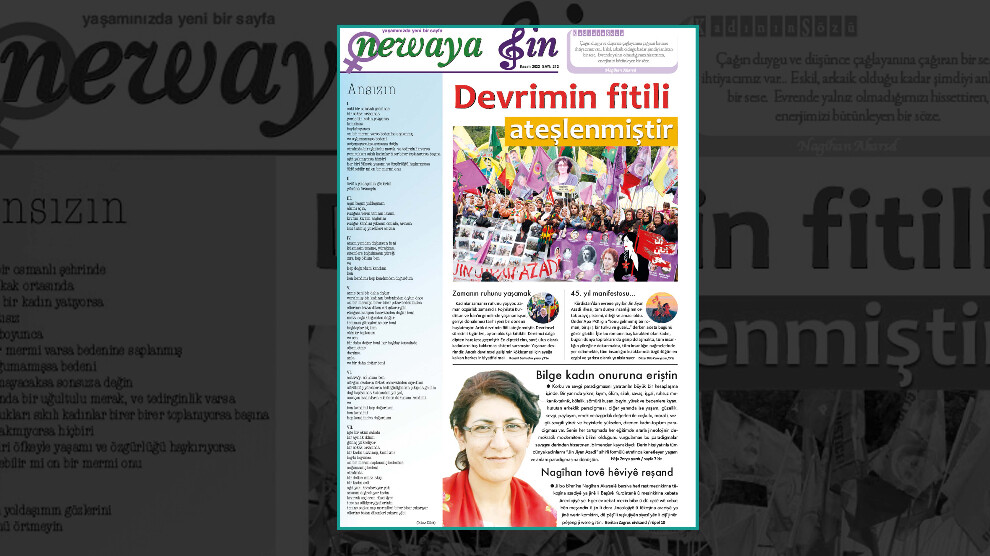 Haber Merkezi - Kadın gazetesi Newaya Jin’ın Kasım sayısı ‘Devrimin fitili ateşlenmiştir’ manşetiyle çıktı. Yeni sayıda, kadın devrimi, siyasi kadın suikastları, 27 Kasım, İmralı tecridi, İran ve Rojhilatê Kurdistan’daki ayaklanmanın yanı sıra edebiyattan sanata da pek çok konu yer aldı.