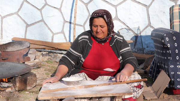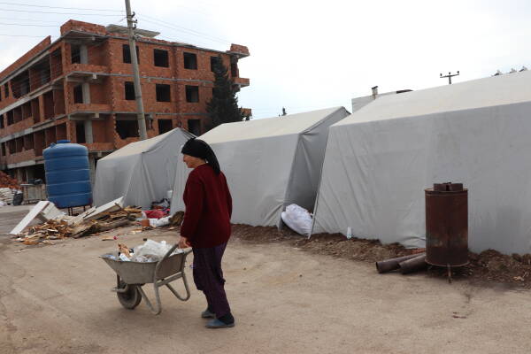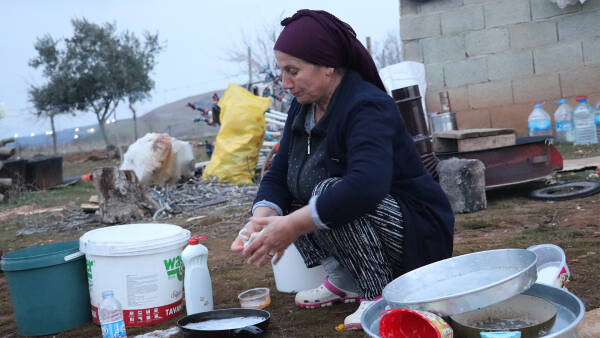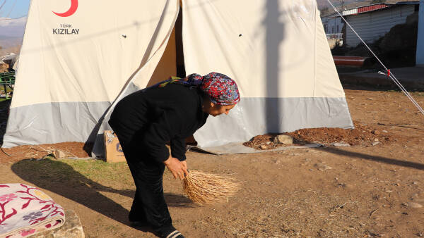 Depremde evleri yıkıldıktan sonra çadıra geçen ve küçük bir çadırda 8 kişi kaldıklarını söyleyen Ayşe Eroğlu, “Halimize bak hele. Lavabo sıkıntısı, banyo sıkıntısı her şey var. Hava soğuk olduğu için rahat uzanamıyoruz. Burada 8 kişi üst üste kalıyoruz hepimiz. Bize konteynır verseler çok iyi olur. Gün boyu yemek derdiyle uğraşıyoruz sabah kahvaltı akşam yemek. Öğlen bulaşık kirlenmesin su yok diye yemek yemiyoruz. Bir öğünü yemek yemeden geçiriyoruz. Çok sıkıntı çekiyoruz. Çadırda kalmak da çok zor. Su yok. Kendi çabamızla gelen hazır sularla her şeyi yapıyoruz. Su olmadığı için elbise de yıkayamıyoruz. Köyde olduğumuzda kazan kaynatıyor o şekilde elbiseleri yıkıyoruz. Kadınlar çok iş yapıyor tabi erkekler ne yapıyor. Yatak kaldır indir yemek çamaşır her işi biz yapıyoruz” diye konuştu.