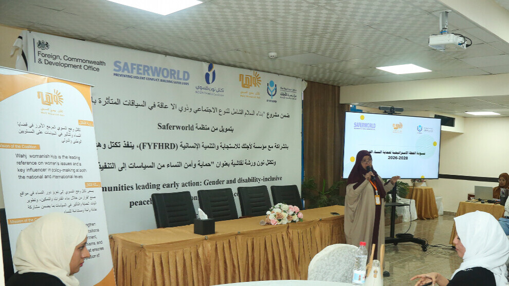 Yemen - Aden’de, Wahaj Feminist Koalisyonu ve Noon Feminist Koalisyonu, “For You for Response and Human Development” Vakfı ile ortaklaşa yürütülen “Çatışmadan Etkilenen Bağlamlarda Toplumsal Cinsiyet ve Engellilik için Kapsamlı Barış İnşası” projesi çerçevesinde, “Kadınların Korunması ve Güvenliği: Politikalardan Uygulamaya” başlıklı bir çalıştay düzenlendi.