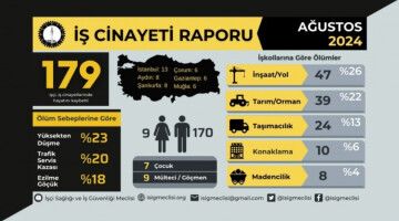 İSİG, Ağustos ayı raporunda, 9’u kadın, 7’si çocuk 179 işçinin iş cinayeti sonucu yaşamını yitirdiğini ortaya koydu.