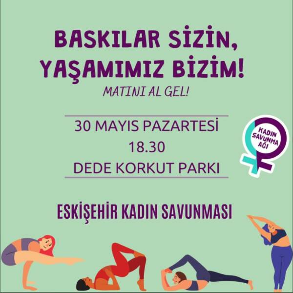 Öte yandan Eskişehir Kadın Savunması’da sosyal medyadan yaptığı paylaşımında çağrıda bulundu. Kadınlar “Baskılar sizin, yaşamımız bizim! Matını al gel, birlikte yoga yapalım” diyerek yarın (30 Mayıs Pazartesi) 18:30’da parka çağrı yaptı.