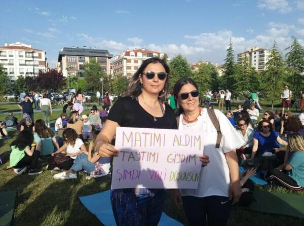 “Onlar istiyor ki kadınlar nefes almasın. Sadece evde otursun, temizlik yapsın çocuk doğursun ve hiç sesi çıkmasın. Yok öyle, bize çizilen sınırları kabul etmiyoruz. Tüm parklar bizim. Biz kadınlar matımızı alır yogamızı yaparız. Şimdi gözlerimizi kapatıyoruz derin bir nefes alıyoruz, nefesimizi yavaşça verirken Yaşasın Kadın Dayanışması diyoruz.”